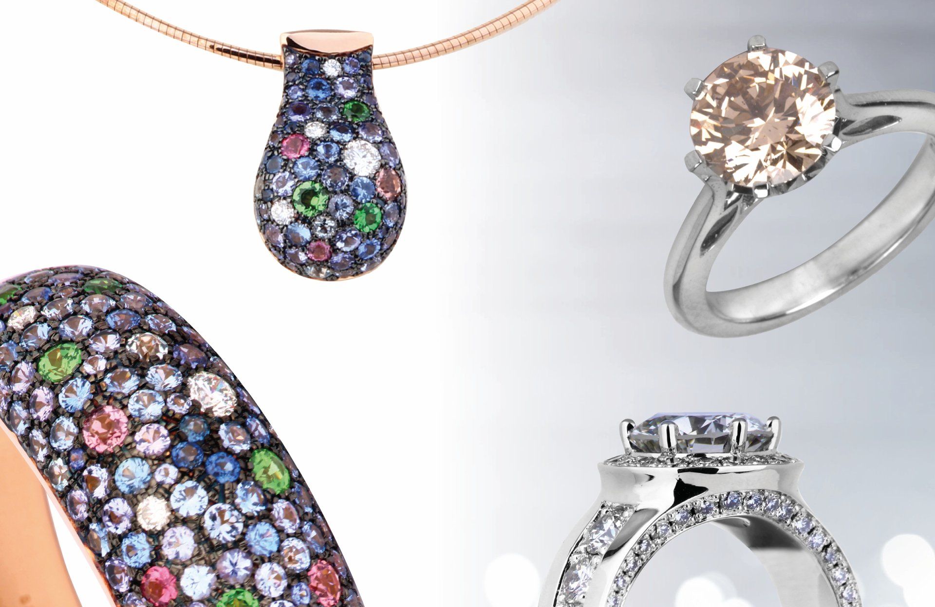 Schmuck, der mit Diamanten oder Farbsteinen besetzt ist, wird im hauseigenen Diamant- und...