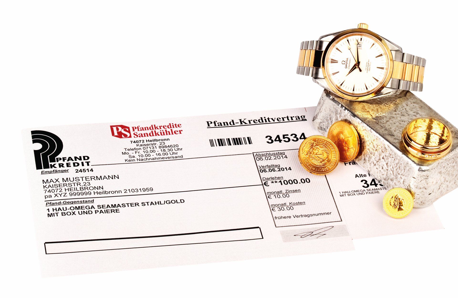 Beleihung von Schmuck, Uhren, Goldmünzen, Goldbarren zu fairen Preisen. Pfandkredit bei Juwelier Sandkühler.